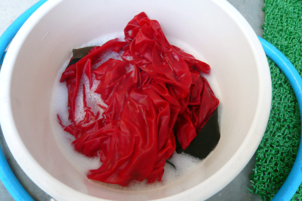 バケツに洗剤を入れて手もみ洗いを始めたところ、