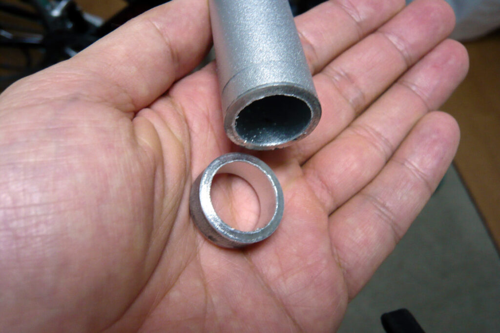 レバーを付け替える前に、先日のサイクリングの時に、ハンドルバーが長過ぎて、車止めの間を通る時にギリギリだったとの相方さんの指摘をうけて、左右1cmずつカットすることにしました。
