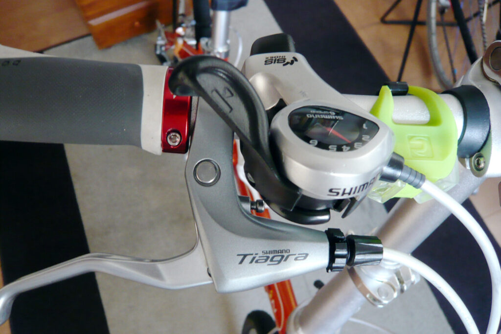 今回は、MTB用のごついDEOREレバーから、ロード系コンポのSHIMANO Tiagraフラットバー用レバーへ変更し、