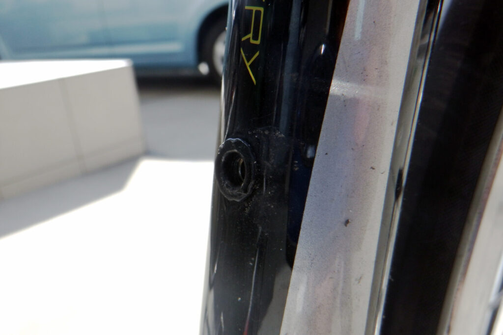 「これ、いつ付いたんや?」と記憶をたどるも、思い当たるのは雨の中の輪行移動。