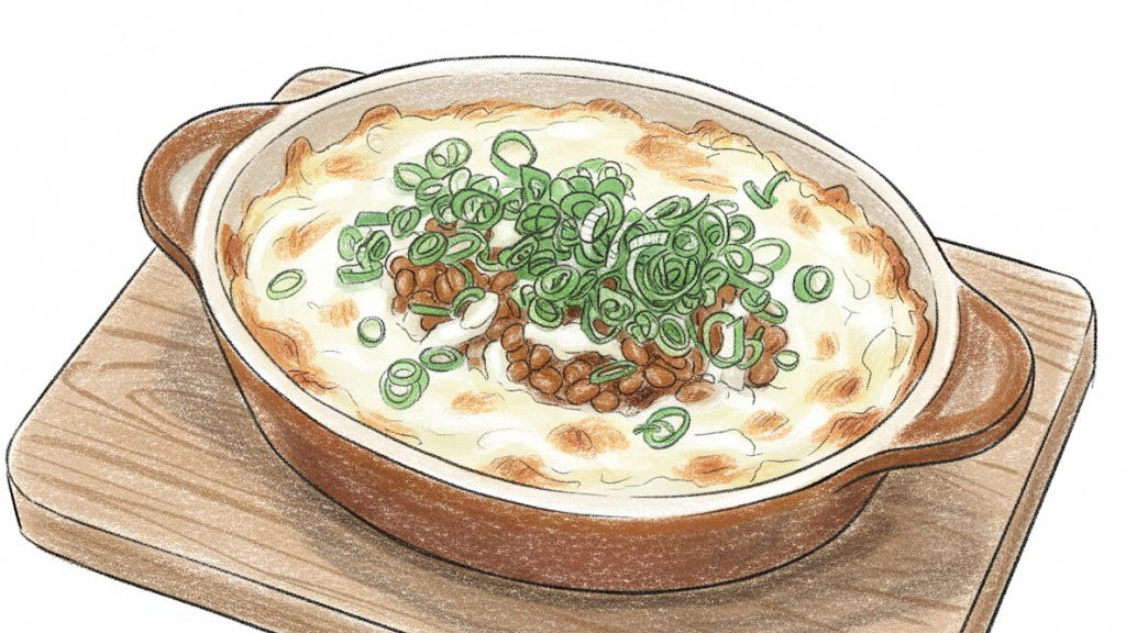 高野山の麓にあるグラタン専門店。名物「ごま豆腐」と納豆を合わせ、バジルソースで仕上げた独創的な一皿です。