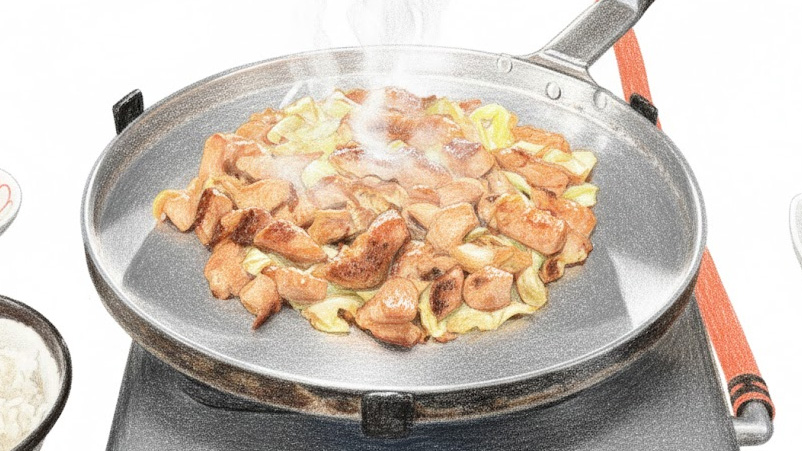 味噌ダレに漬け込んだ鶏肉とキャベツを鉄板で焼いた「鶏ちゃん(けいちゃん)」。ご飯との相性が抜群で、箸が止まらない美味しさです。