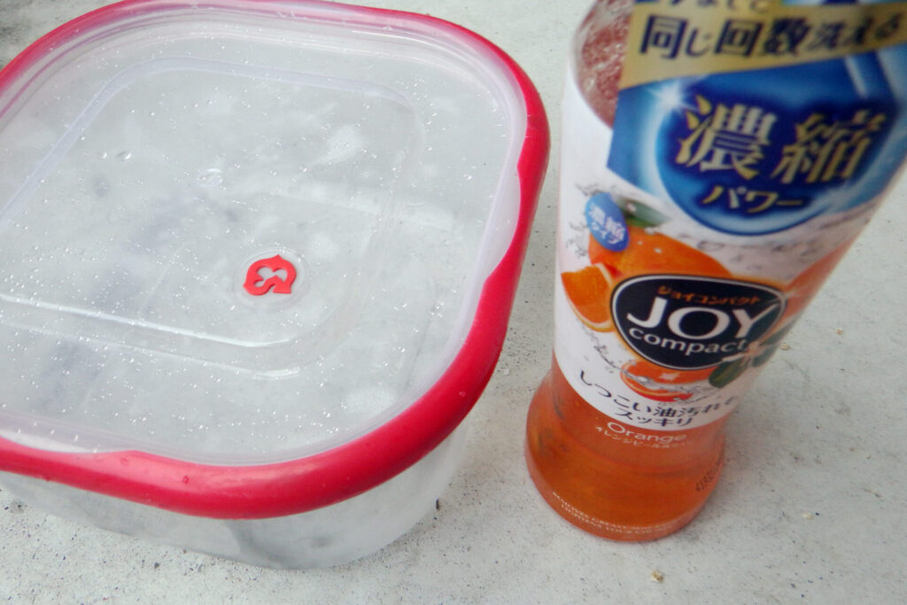 ホームセンターで、食器用洗剤のジョイとスプロケットが入るくらいの大きさのタッパを買いました。