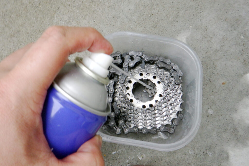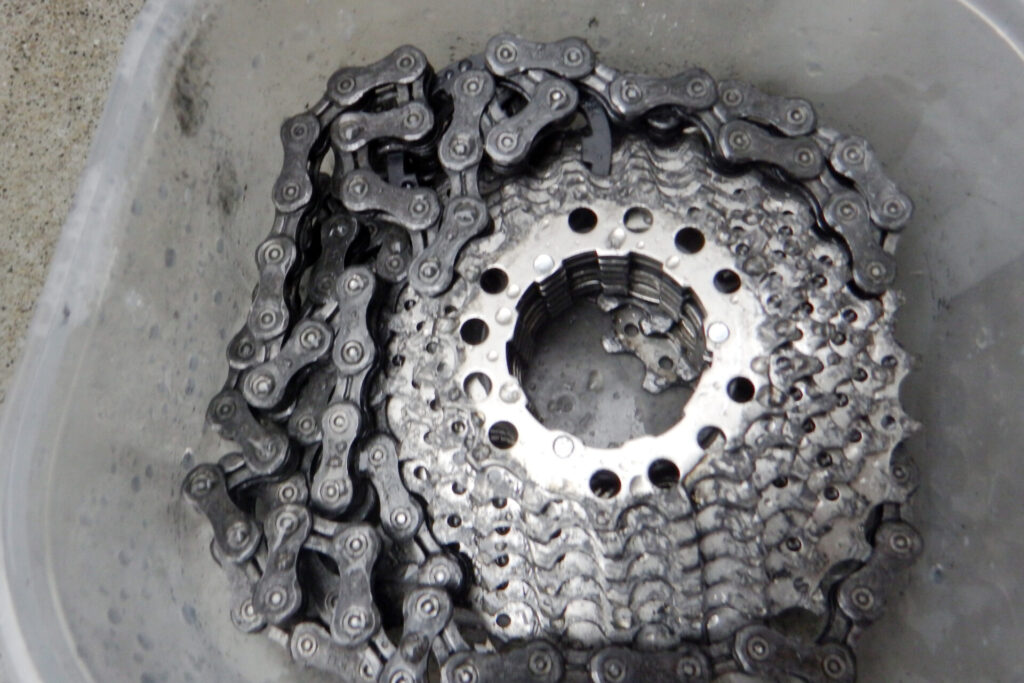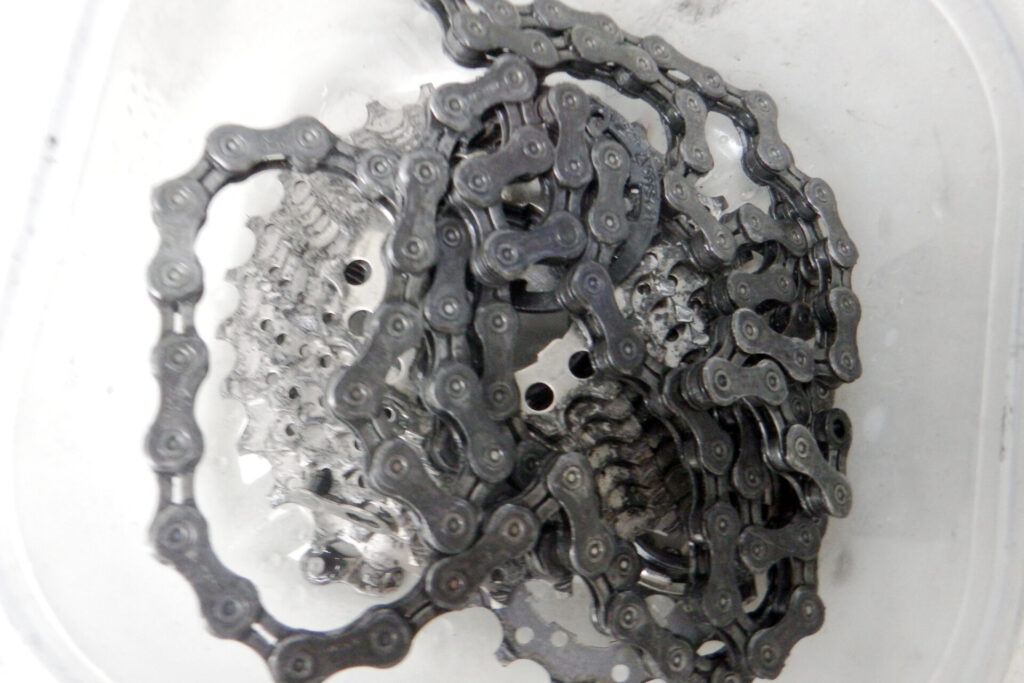 チェーンだけ掃除をするのだったら、ペットボトルに洗剤と水とチェーンを入れて蓋をしてシェイクすると、汚れが飛び散る心配がないので、簡単だと思います。